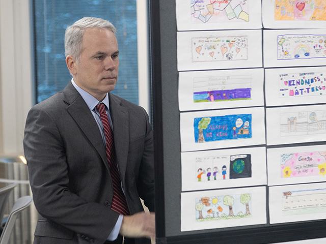 Following the announcement of the winners, the justices and judges took turns discussing the messages displayed in the artwork with the students. Each bookmark, individual and unique, focused on resolving or preventing conflict by depicting various actions such as apologizing, respecting differences, talking things out, working together, listening, tolerance, diversity, inclusion, building peace, respecting one another, understanding someone else’s point of view, being considerate of people with varied abilities, and simple kindness for others as alternatives to violence.